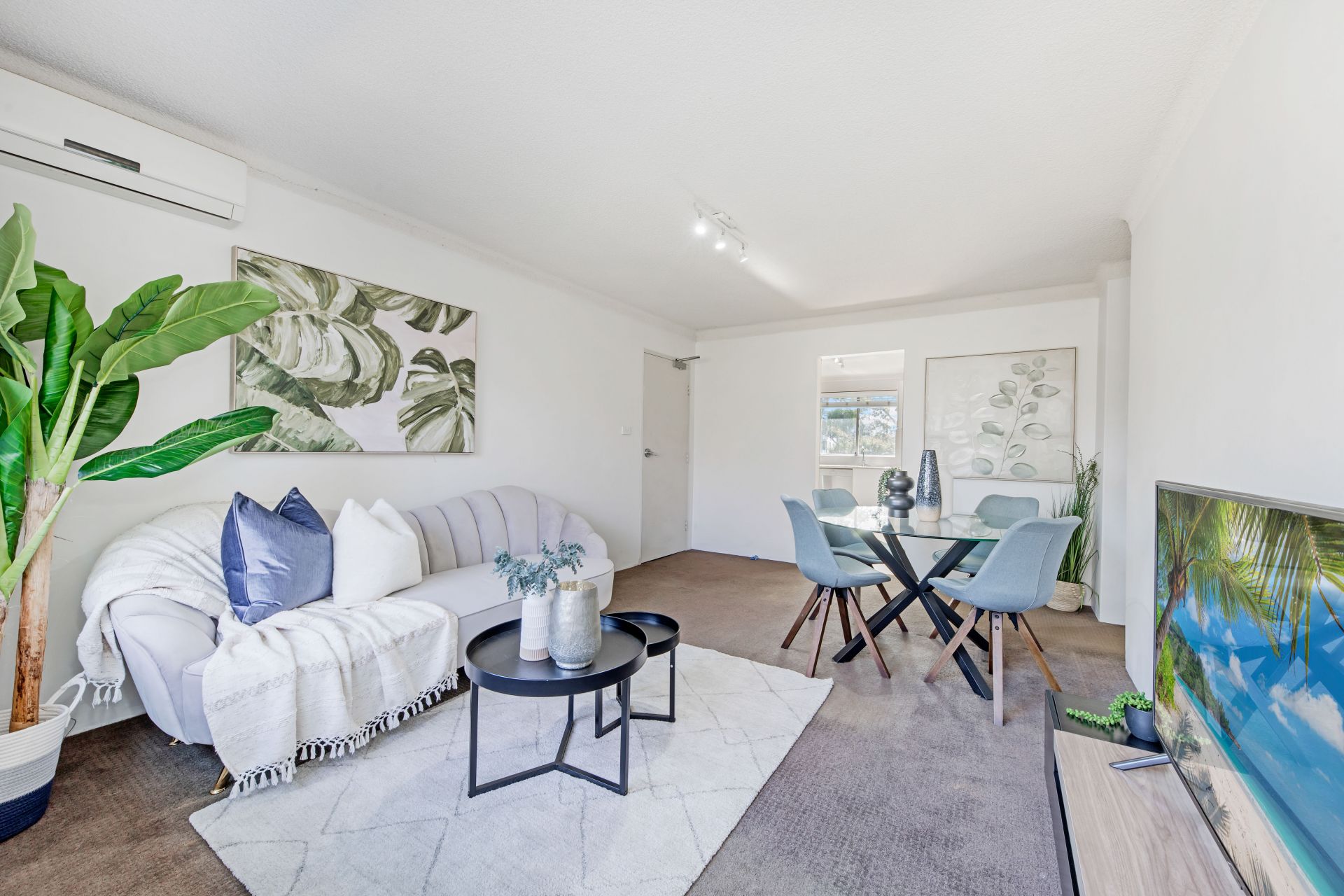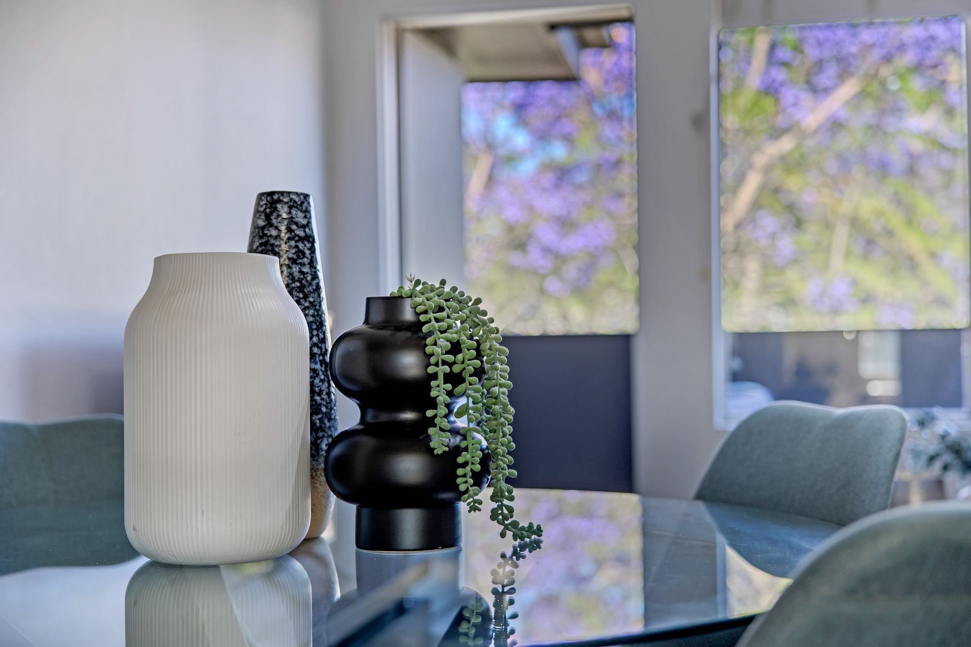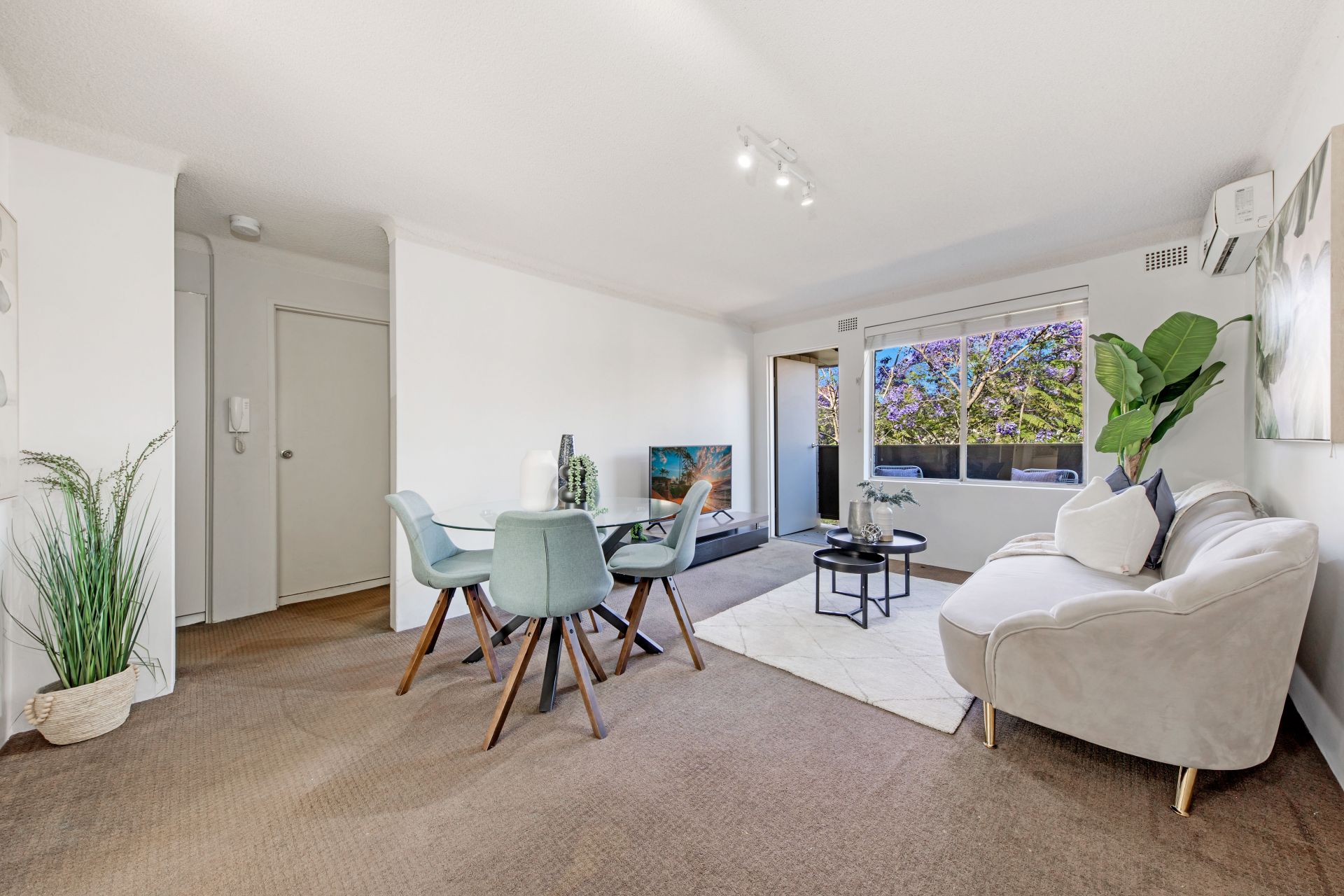 * Open plan living with green view through the balcony
