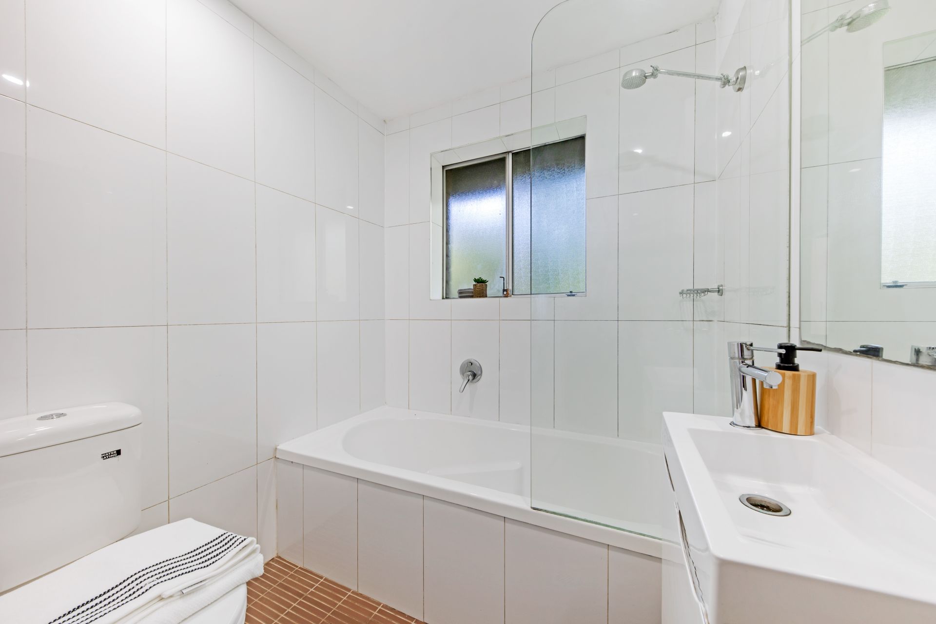 * Floor to ceiling tiled bathroom with shower and bathtub
